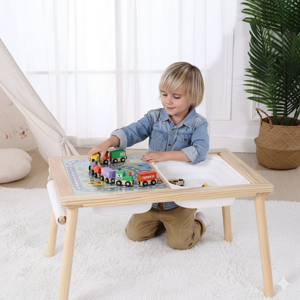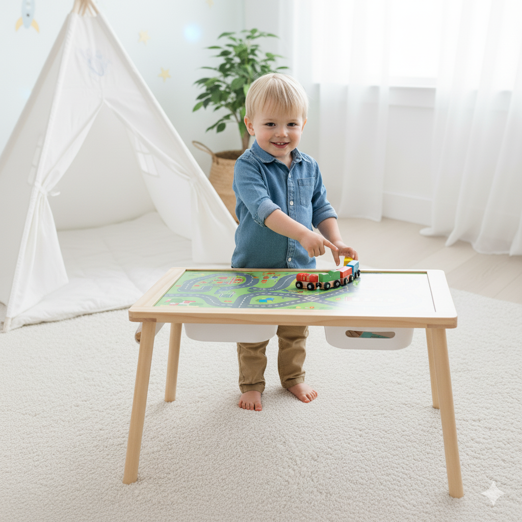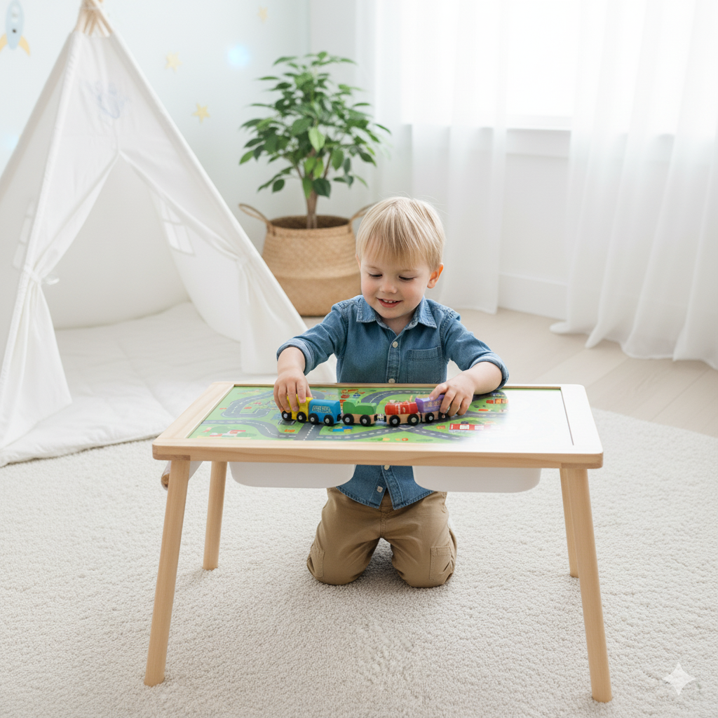 Poprzez rysowanie, malowanie i zabawę na mapie, dziecko ćwiczy **precyzję ruchów** oraz **koordynację ręka-oko**. Wspólna zabawa przy stoliku naturalnie rozwija **zdolności społeczne**, ucząc współpracy i komunikacji. To mebel, który jest sercem twórczej zabawy!
