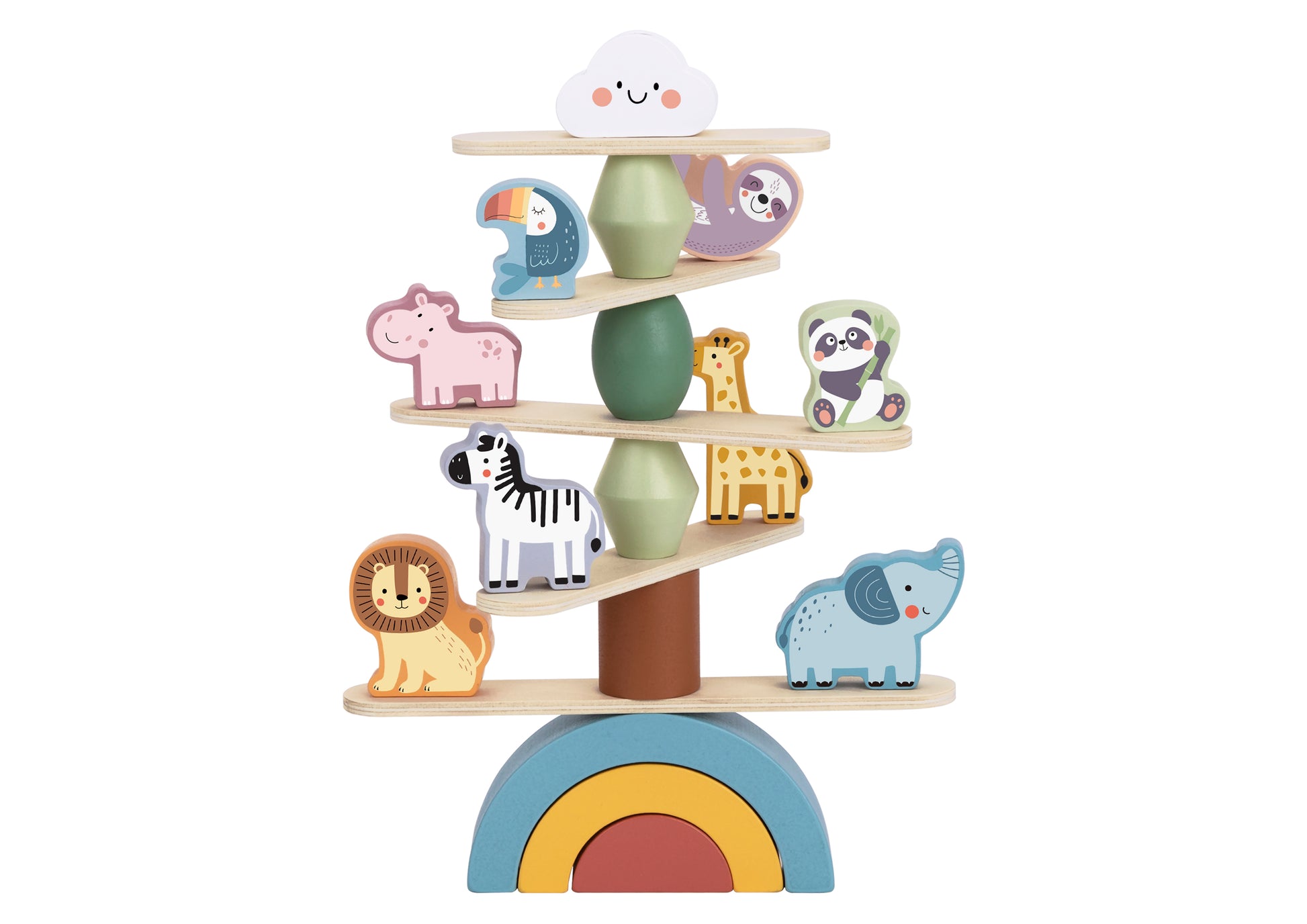 Zestaw zawiera aż 29 elementów: 12 uroczych drewnianych zwierzątek oraz 16 akcesoriów do balansowania (tęcza, chmurki, kamienie, platformy). Wykonany z drewna z certyfikatem FSC, jest ekologiczny, bezpieczny i trwały.