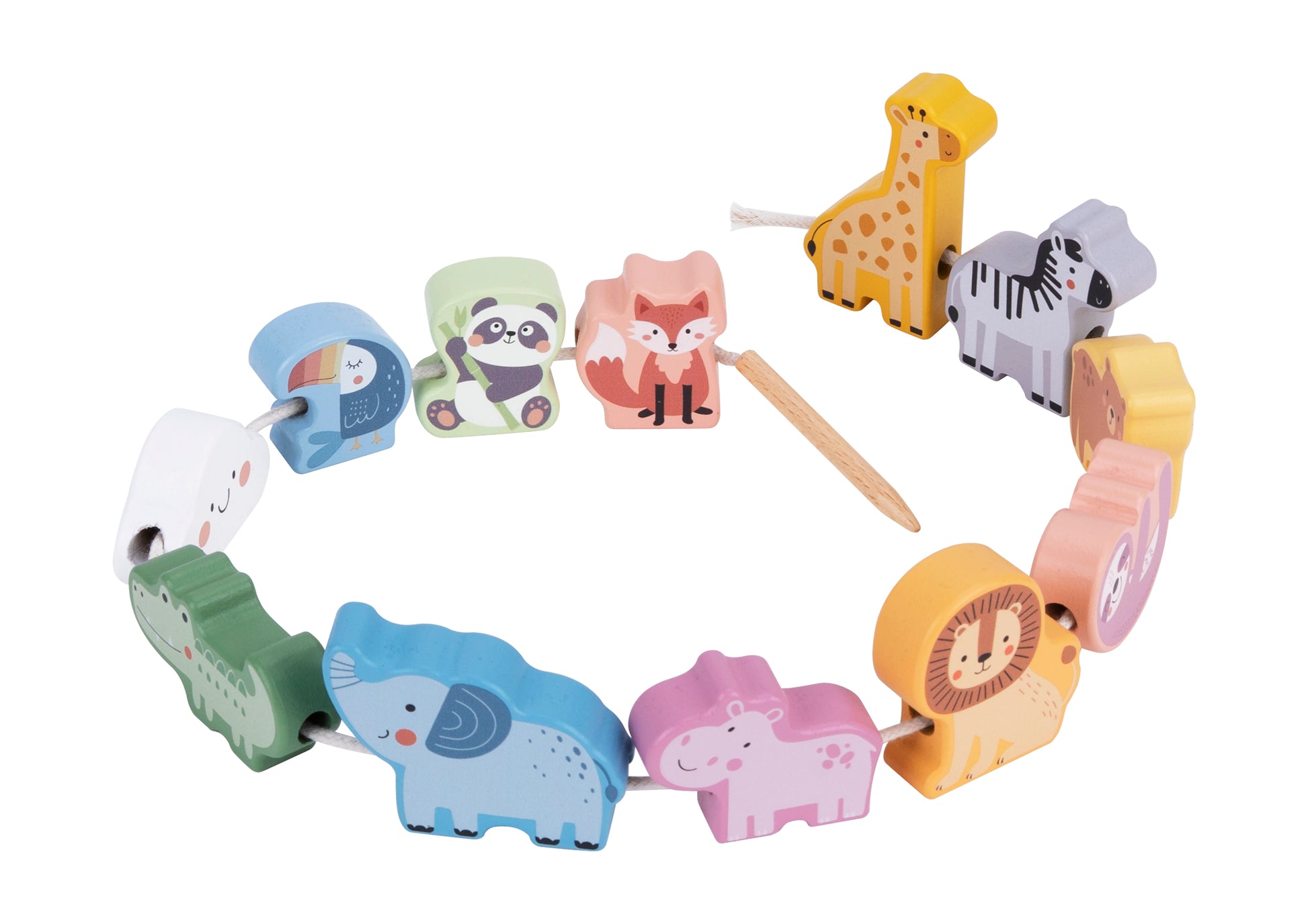 W zestawie znajdziesz 11 uroczych, drewnianych zwierzątek i wesołą chmurkę, które można nawlekać na dołączony sznureczek. Każde zwierzątko posiada specjalne otwory, które zachęcają do precyzyjnego przeplatania. Wszystkie elementy zostały wykonane z naturalnego i bezpiecznego drewna oraz pomalowane nietoksycznymi farbami – z myślą o najmłodszych odkrywcach i środowisku.