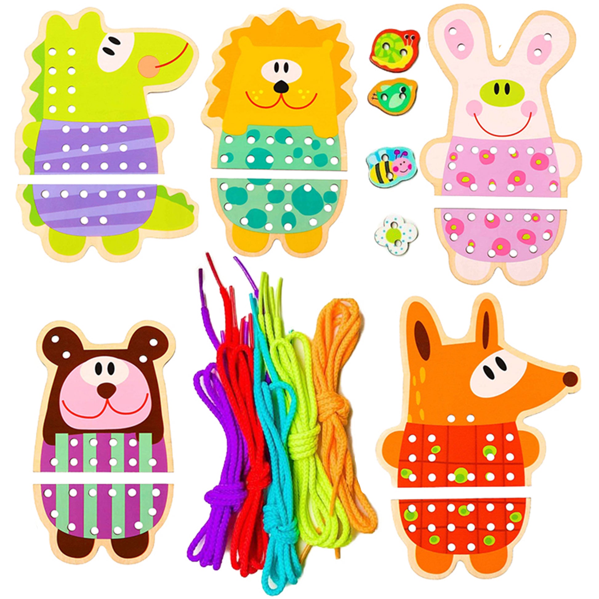 Zestaw zawiera 5 kolorowych, drewnianych zwierzątek (miś, lew, krokodyl, świnka, lis) z otworkami. Kluczowym elementem jest możliwość „przyszycia” detali do każdego zwierzaka za pomocą 5 kolorowych sznureczków. To doskonałe przygotowanie do nauki pisania i pracy z drobnymi przedmiotami!