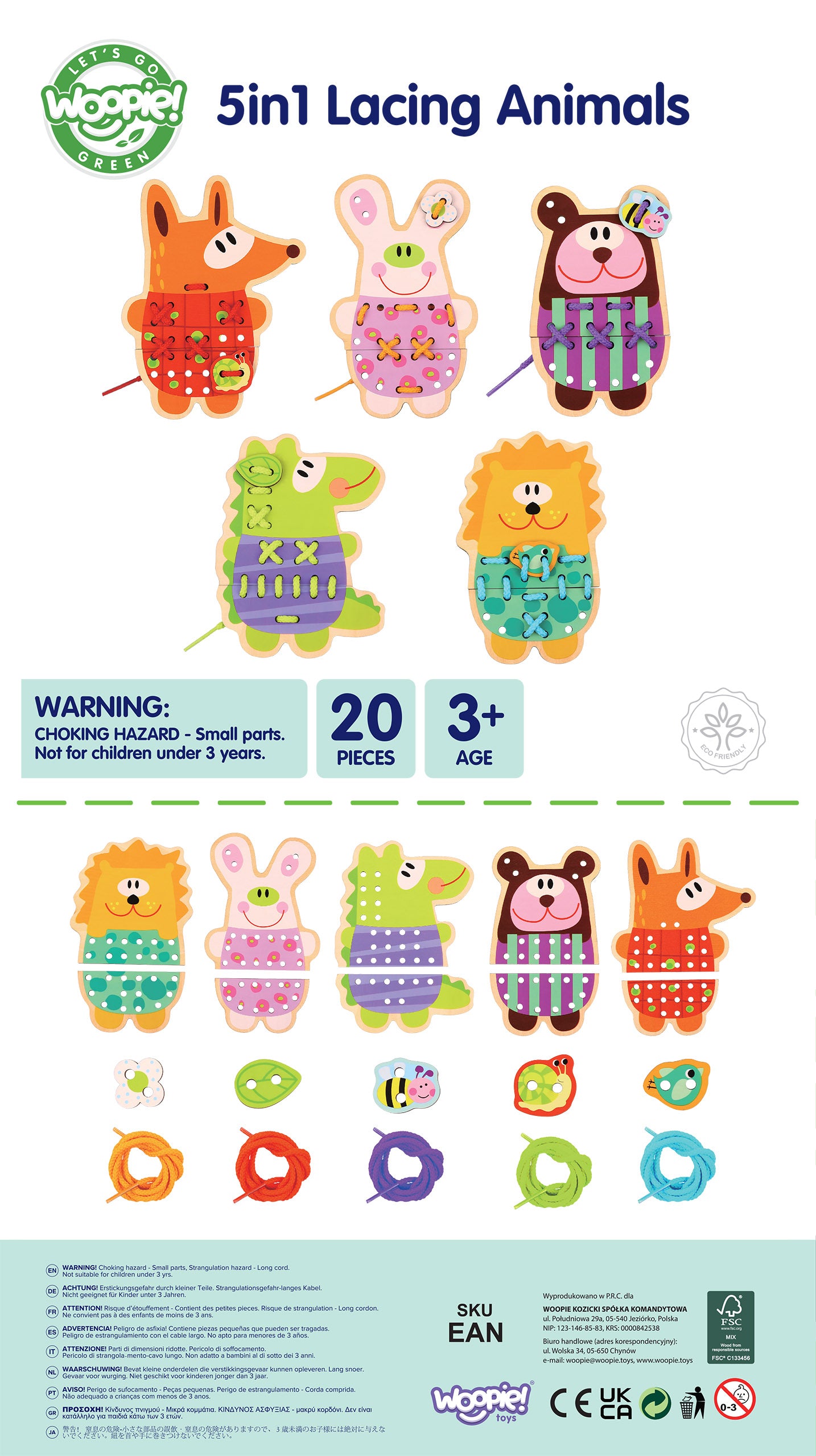 Ucz się i baw z WOOPIE GREEN! Drewniane Zwierzątka do Nawlekania 5w1 to uroczy i edukacyjny zestaw, który przenosi dzieci do świata kreatywnej zabawy. Aż 20 elementów w zestawie zachęca maluchy do intensywnego ćwiczenia zręczności i rozwijania motoryki małej.