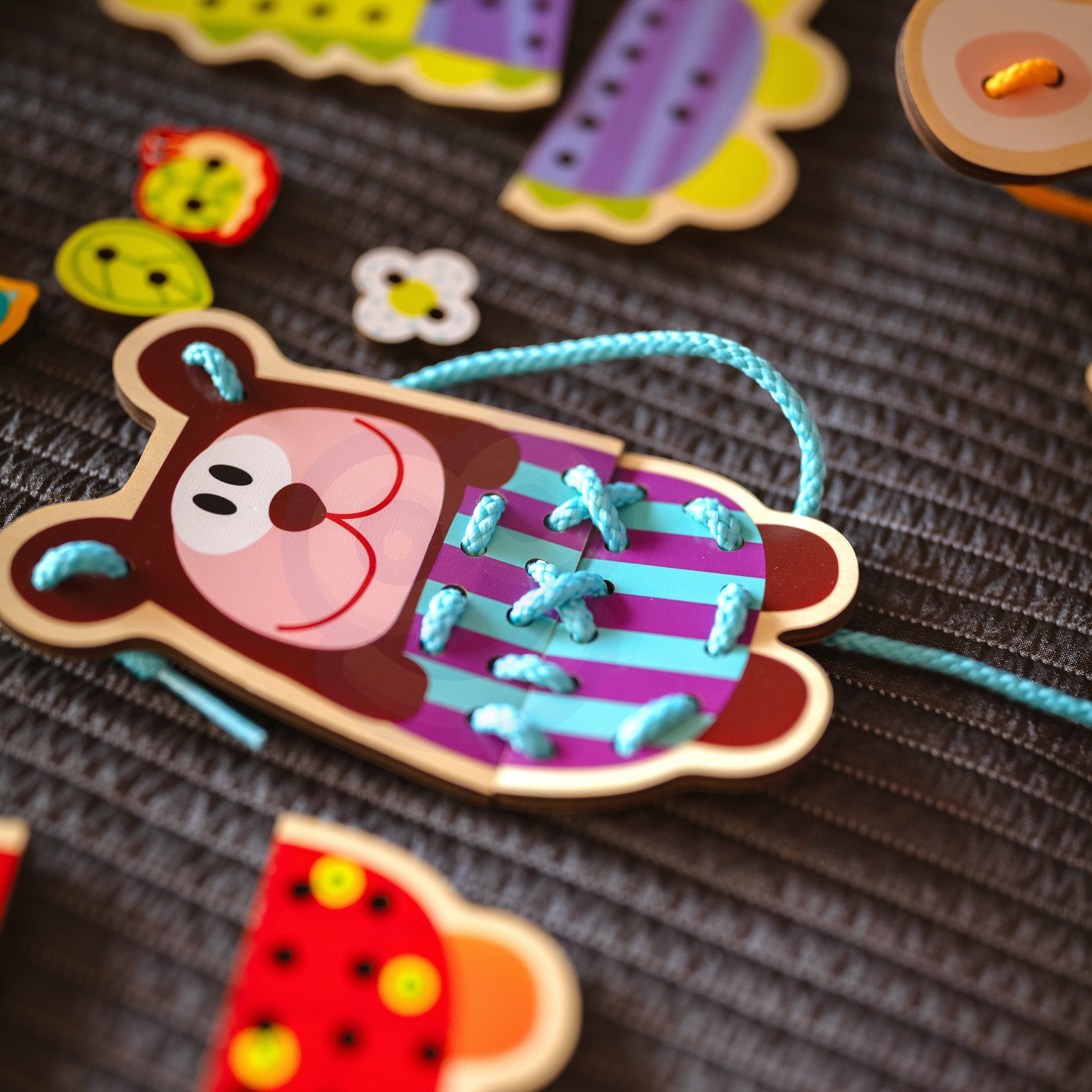 Sznurowanka jest idealna dla małych rączek od 3 roku życia. Zestaw wykonano z wysokiej jakości drewna, pomalowano nietoksycznymi farbami, więc jest w pełni bezpieczny dla dziecka. Zabawa rozwija kluczowe umiejętności: