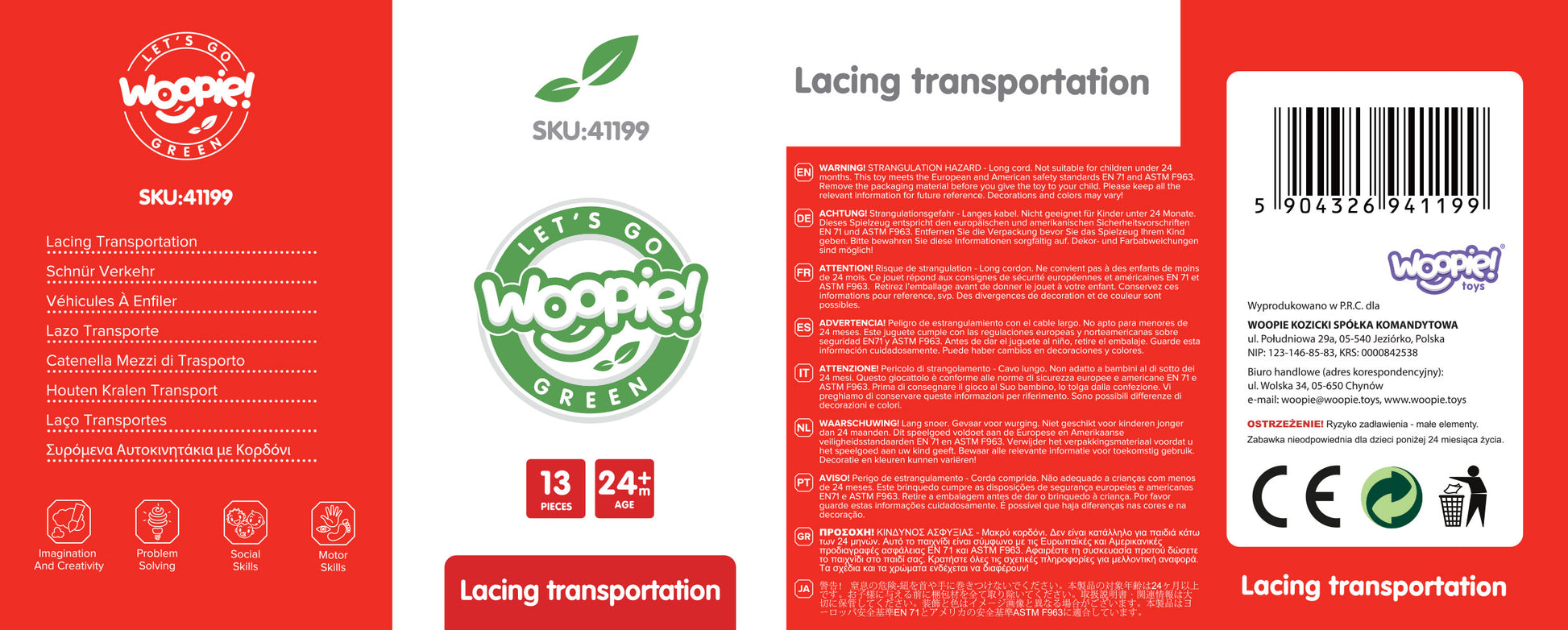 Ruszaj w drogę z wyjątkową przeplatanką od WOOPIE GREEN! Klocki Koraliki Pojazdy to fantastyczna forma nauki i zabawy, która pobudza obszary w mózgu i rozwija zdolności manualne dziecka już od 2 roku życia. Maluch może nawlekać drewniane klocki przedstawiające samochody, straż pożarną, karetkę, traktor i znaki drogowe!