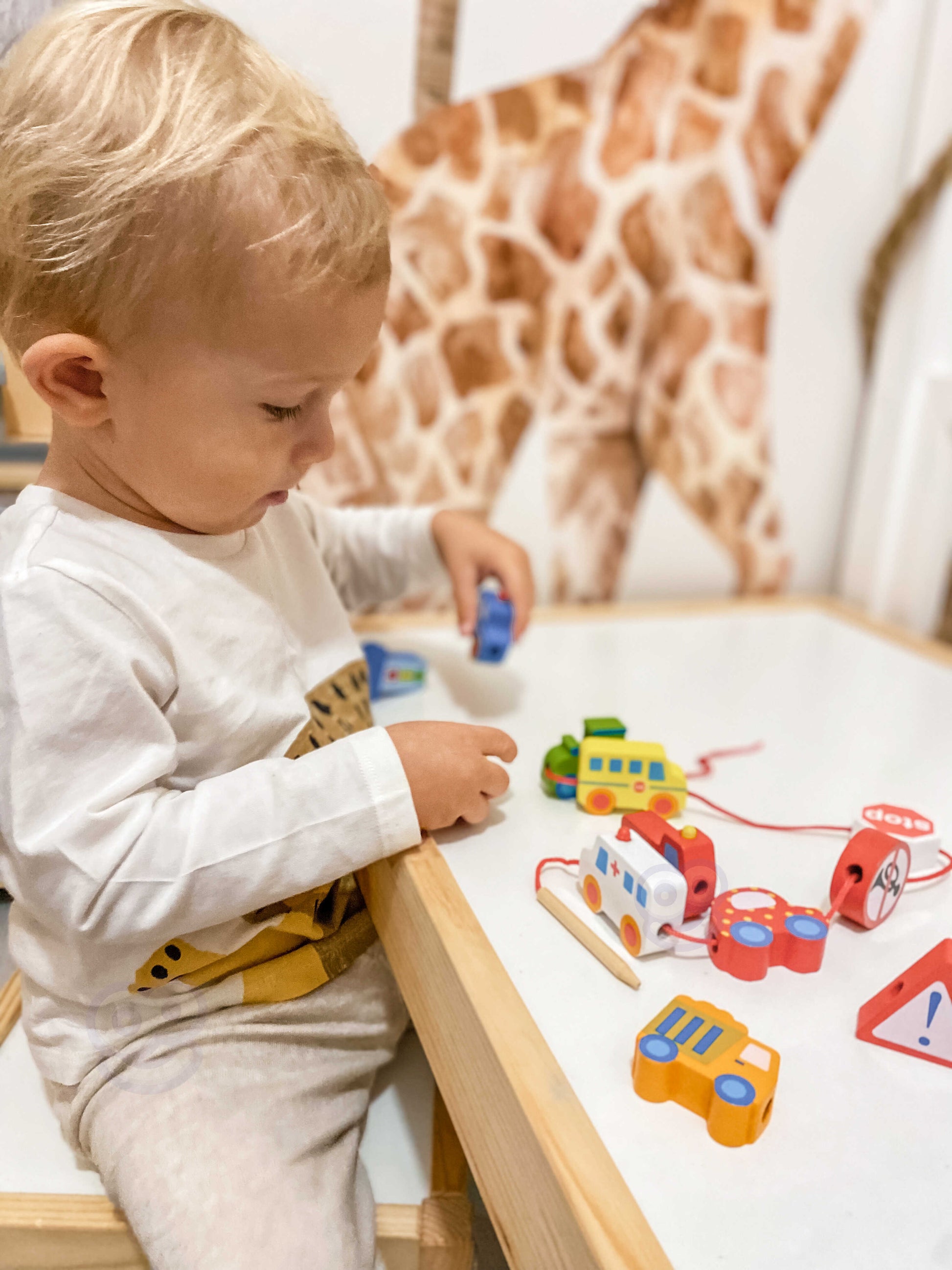 Zestaw zawiera 12 drewnianych klocków oraz 1 sznureczek. Zabawa polega na przeplataniu sznurka przez otwory w klockach, co jest nie tylko świetną frajdą, ale również doskonałym wsparciem rozwoju małych rączek. Dzięki naturalnemu drewnu i ekologicznemu wykonaniu, zabawka jest trwała i w pełni bezpieczna dla dziecka.