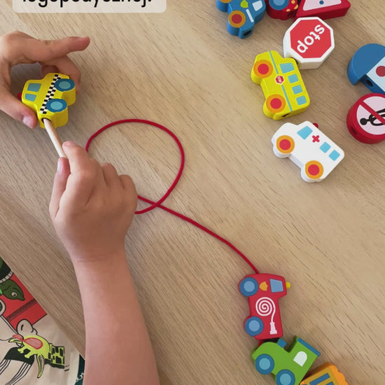Opowieści na Sznureczku: Pojazdy | Drewniana Nawlekanka z Autami | WOOPIE GREEN