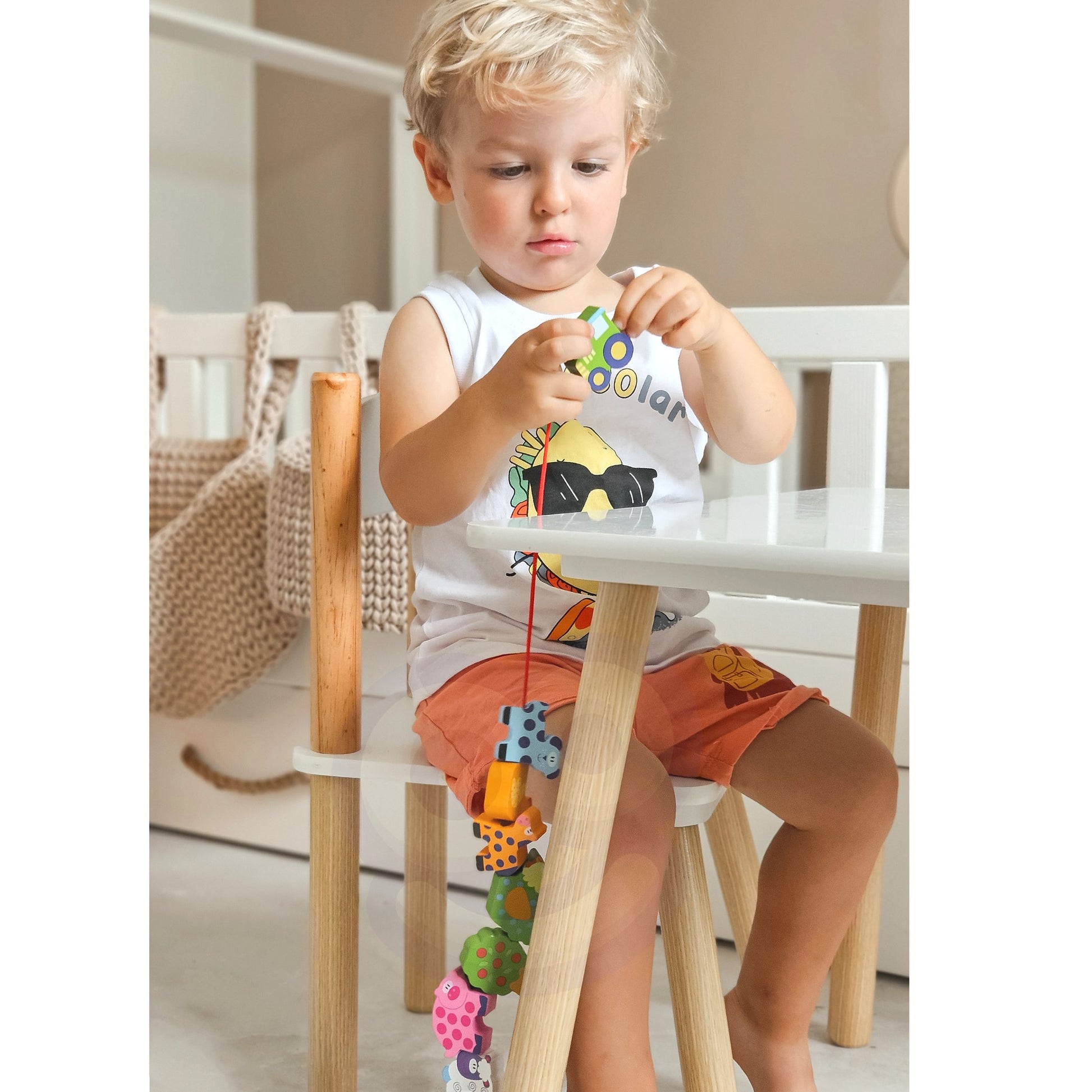 Zabawka jest idealna dla dzieci od 2 roku życia. Dziecko nawleka 12 drewnianych klocków z otworami na dołączony sznureczek, ćwicząc przy tym zręczność, koncentrację i cierpliwość. Wykonana z naturalnego drewna i pomalowana nietoksycznymi farbami, nawlekanka jest ekologiczna i bezpieczna dla dziecka.