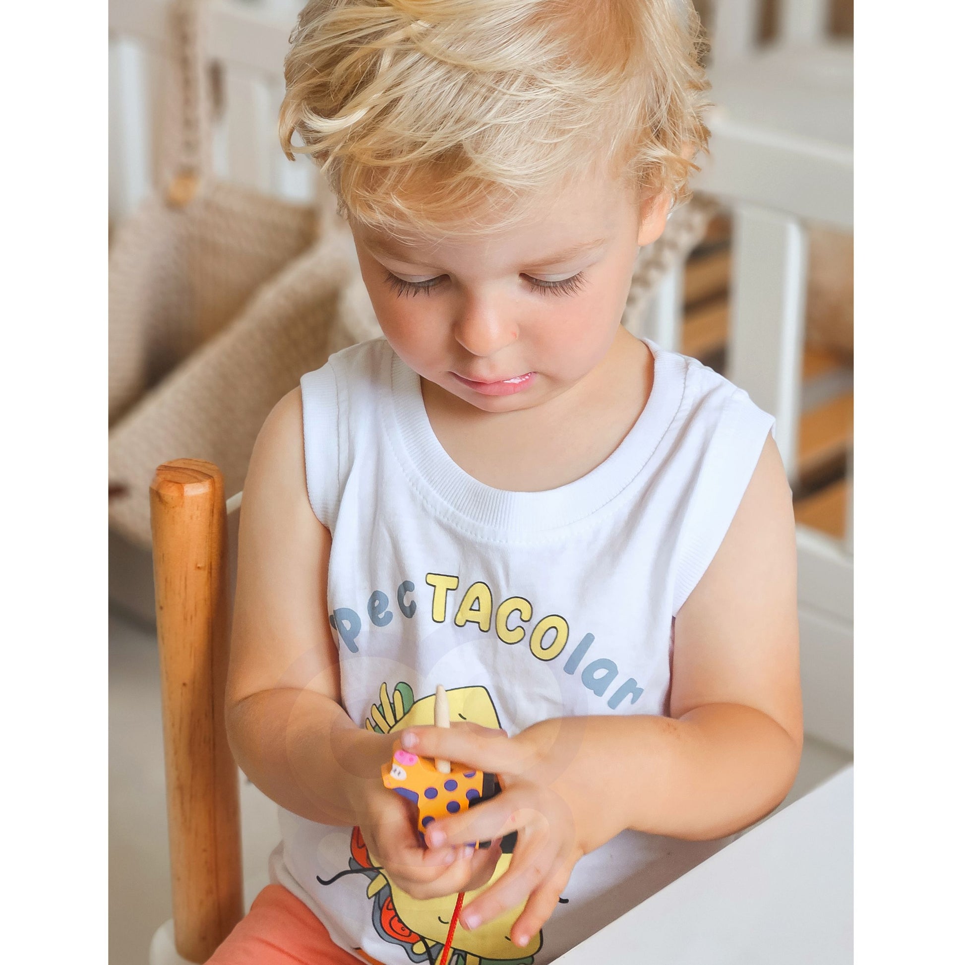 - Zdolności Manualne / Motoryka Mała: Celne nawlekanie i przeplatanie ćwiczy precyzję dłoni i palców, wspierając mięśnie dłoni potrzebne do przyszłej nauki pisania.