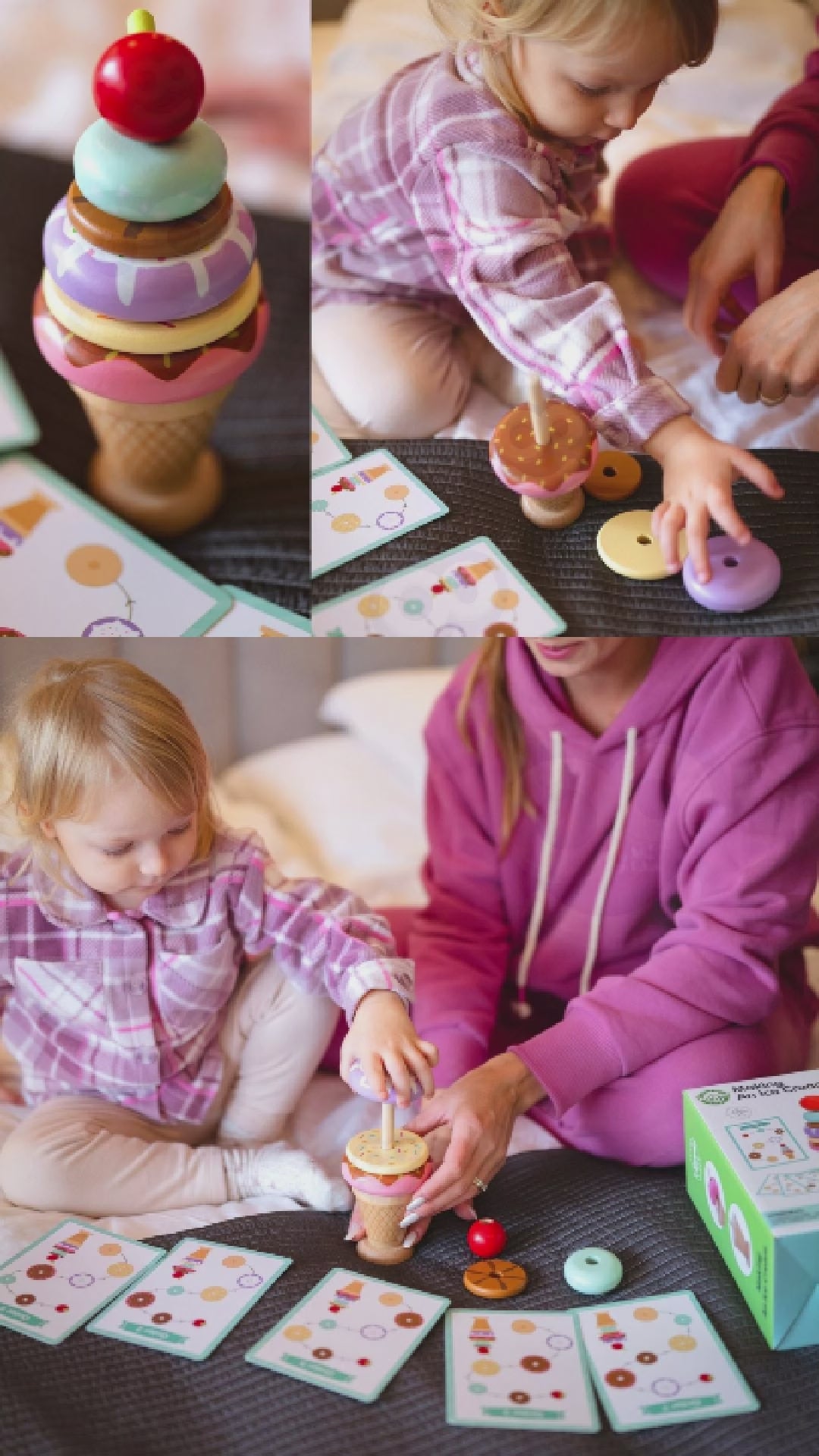 Dzięki temu zestawowi maluch uczy się rozpoznawania kolorów i kształtów oraz trenuje koncentrację i zapamiętywanie.