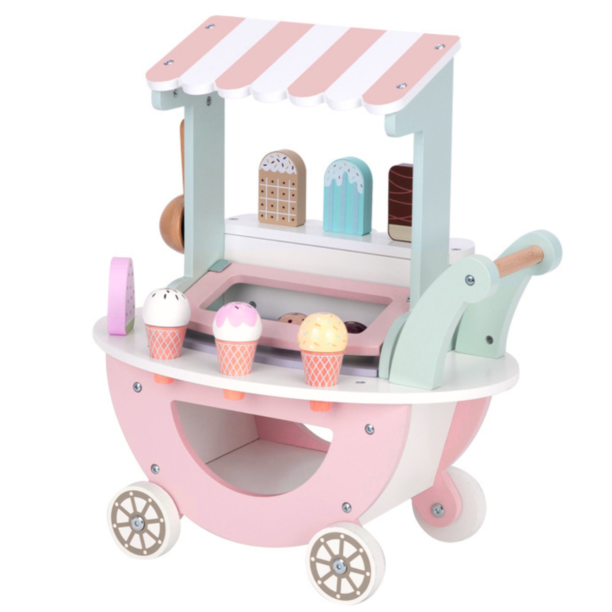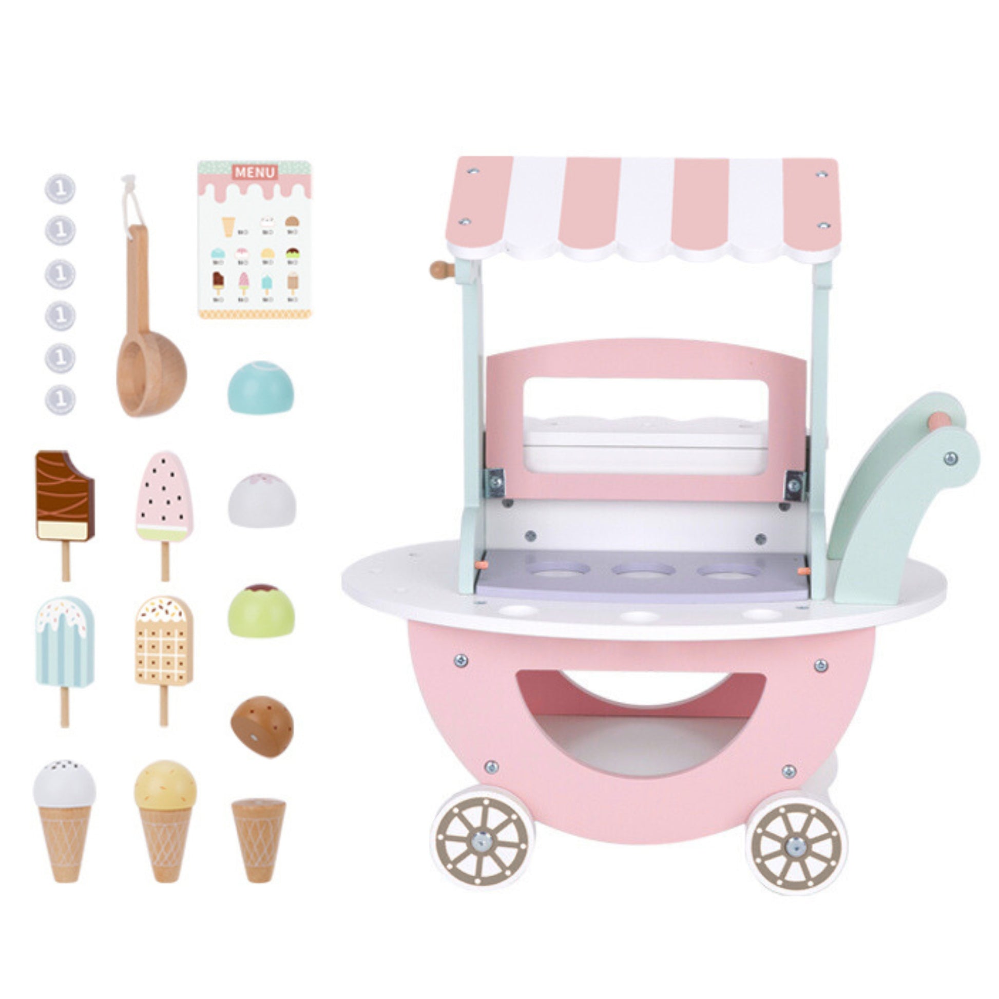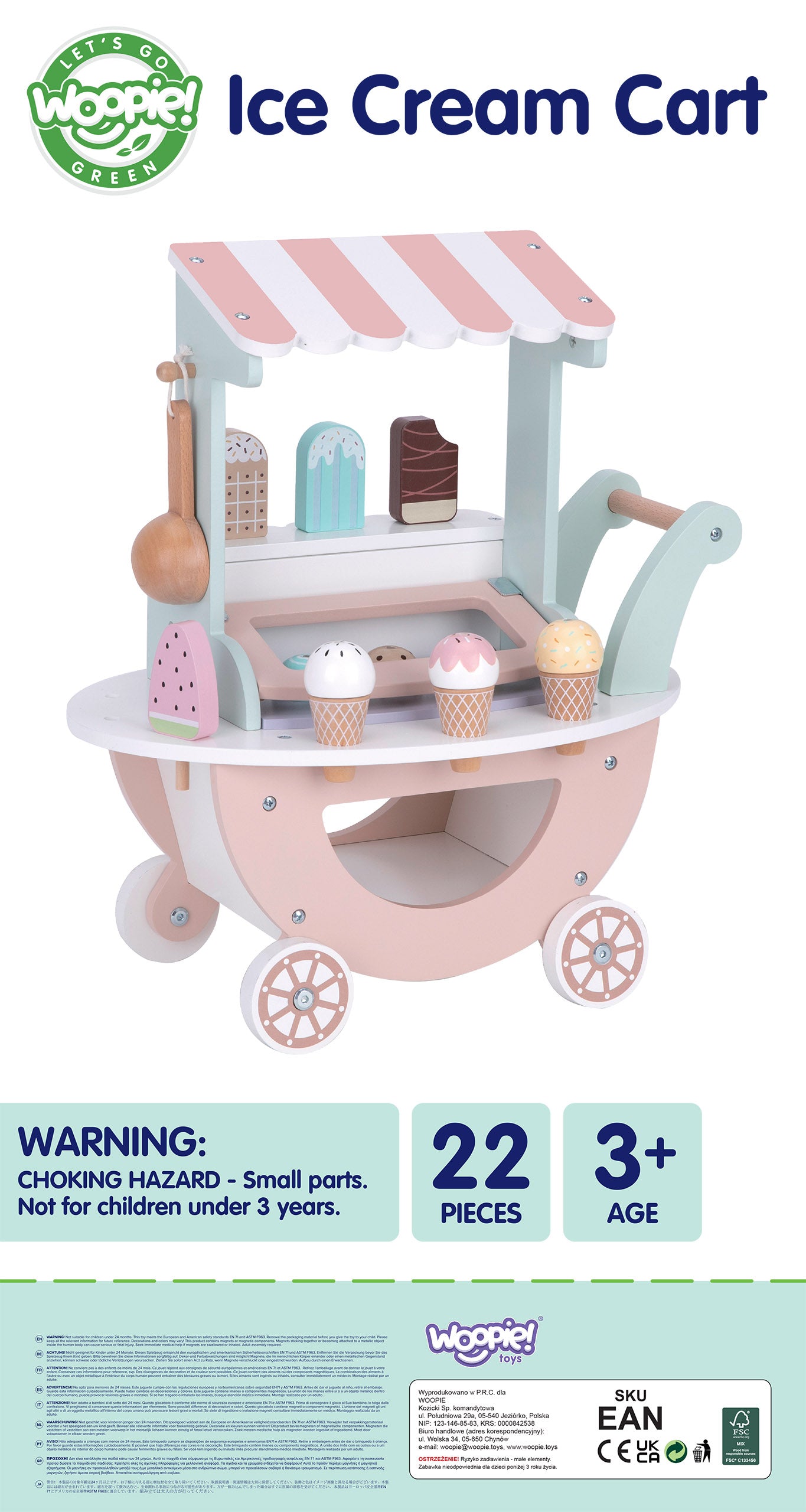 Ten duży drewniany wózek na kółkach to drewniana, bezpieczna i ekologiczna zabawka, idealna dla dzieci od 3 roku życia. Zestaw zawiera aż 27 akcesoriów, w tym kolorowe gałki lodów, wafelki, lody na patyku i zabawowe monety.