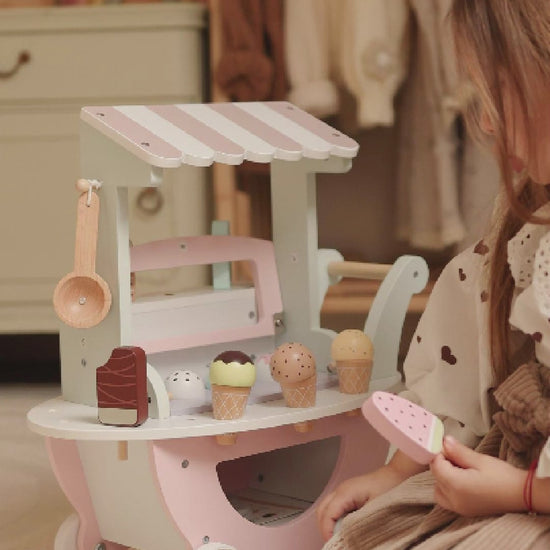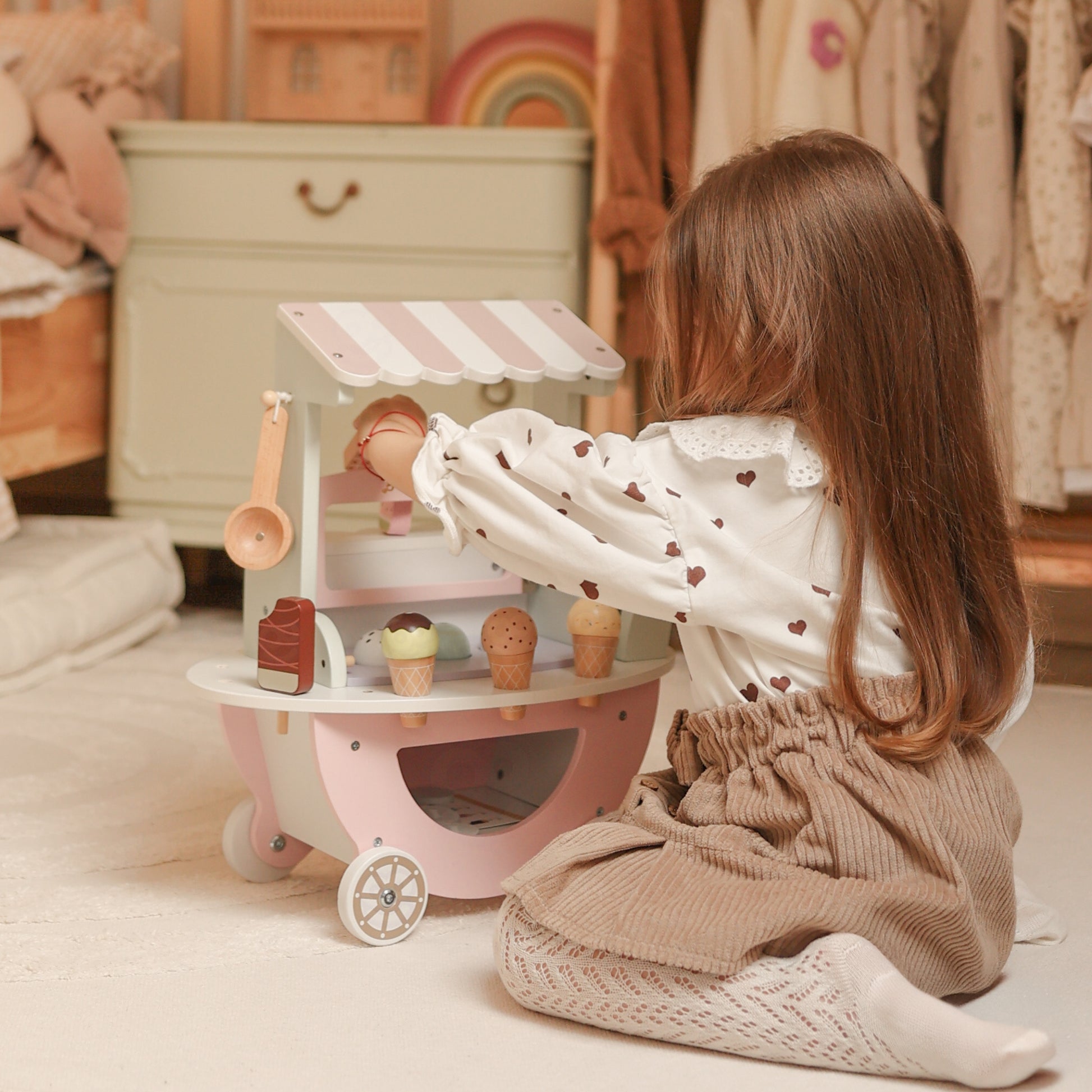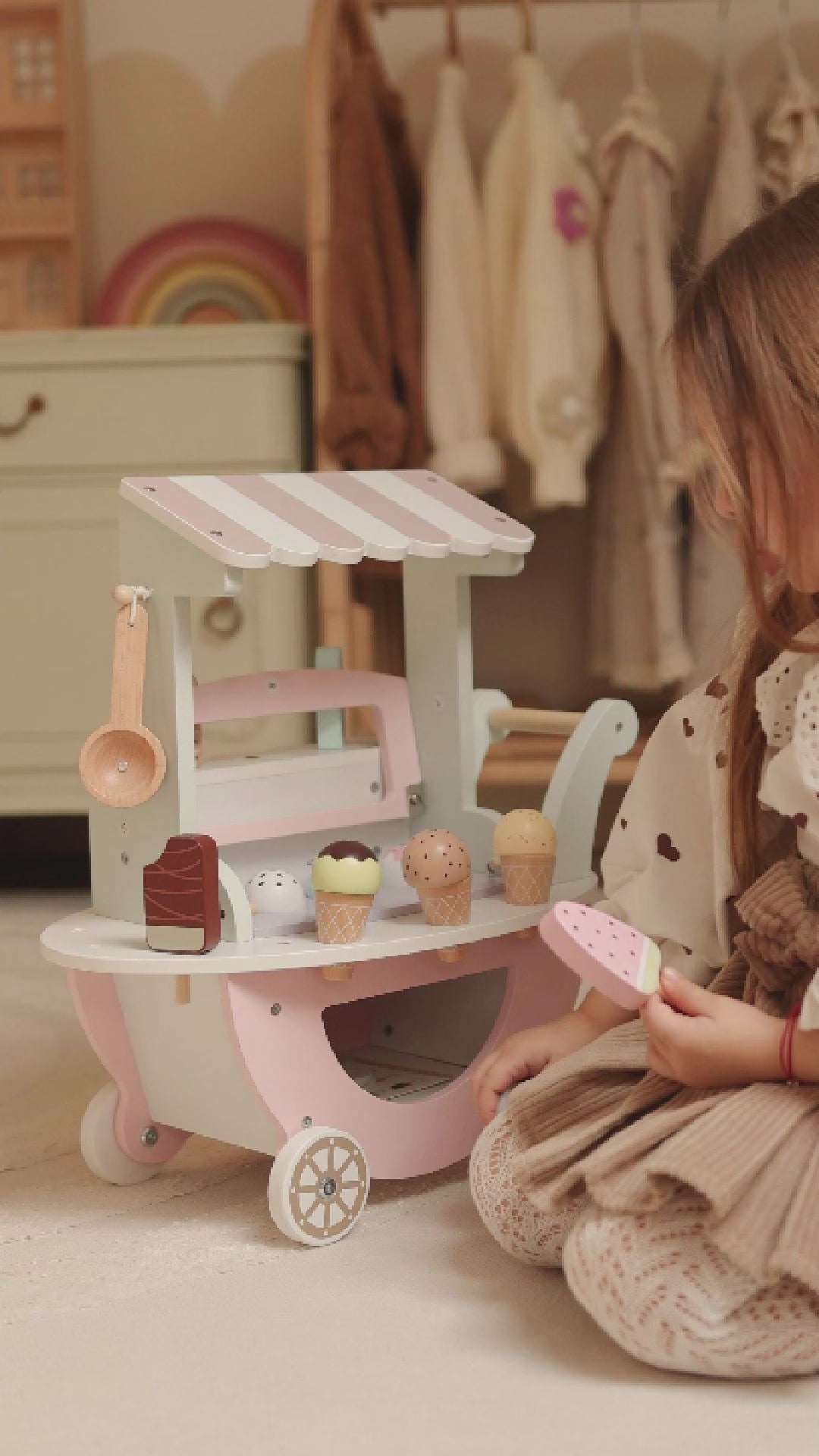 Ten duży drewniany wózek na kółkach to drewniana, bezpieczna i ekologiczna zabawka, idealna dla dzieci od 3 roku życia. Zestaw zawiera aż 27 akcesoriów, w tym kolorowe gałki lodów, wafelki, lody na patyku i zabawowe monety.
