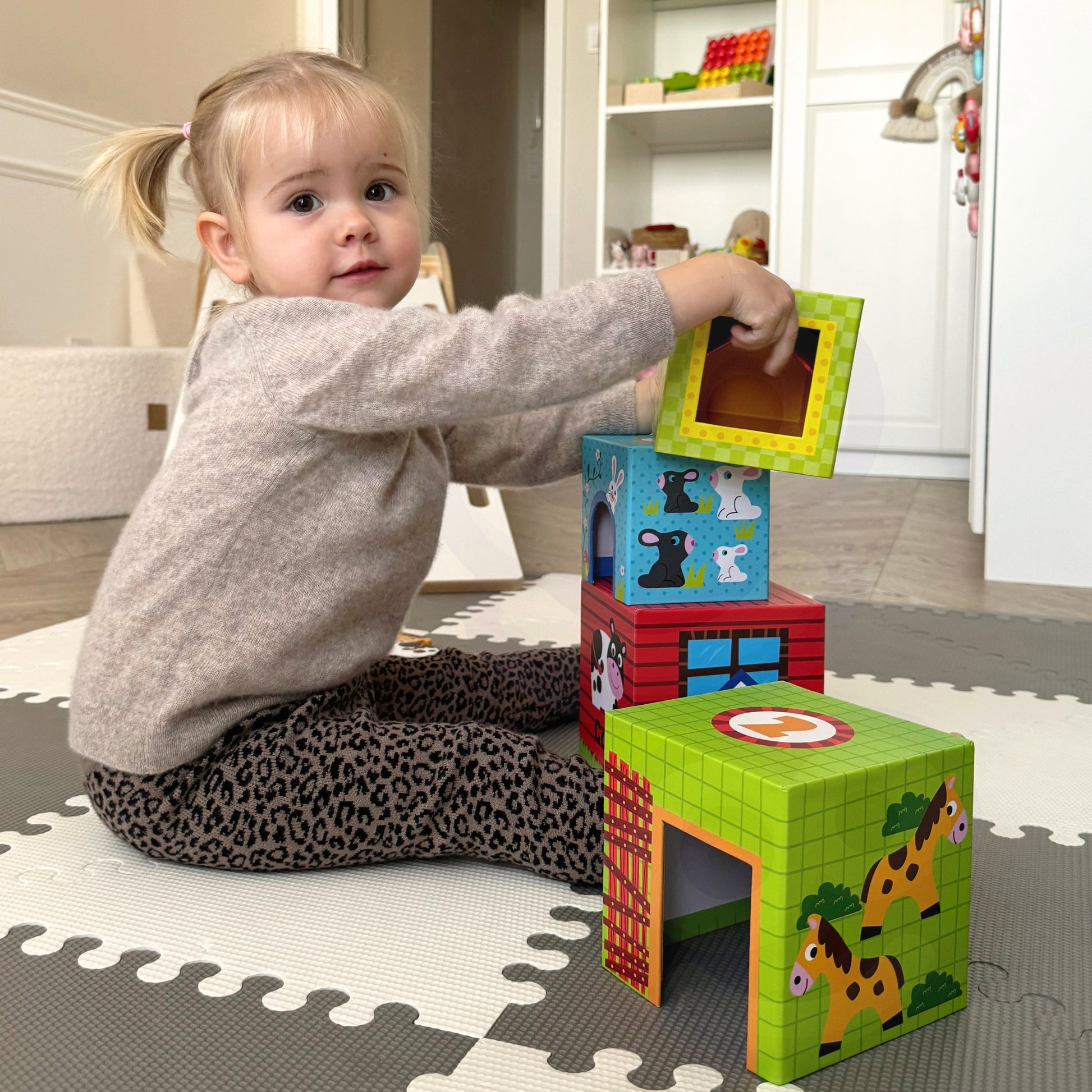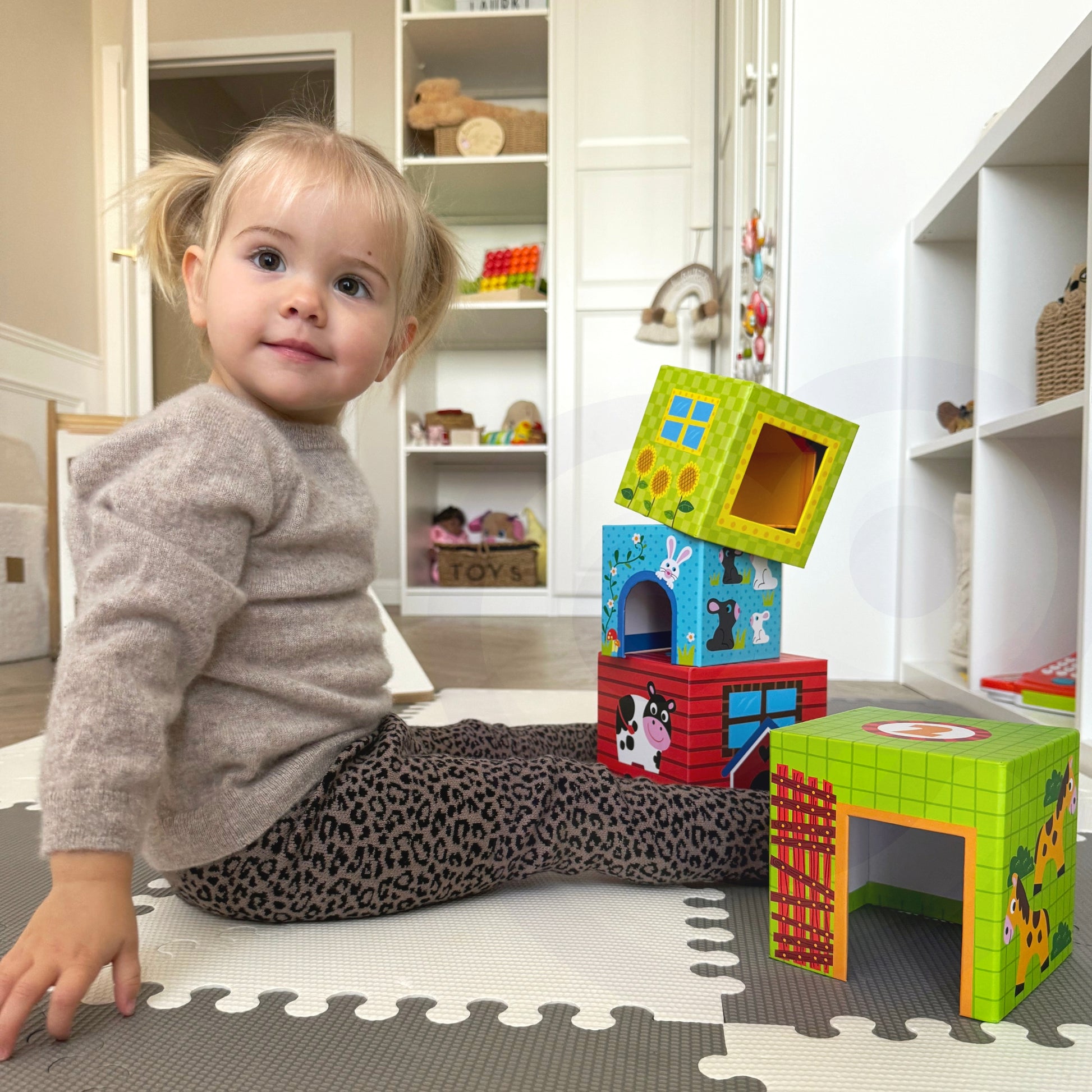 Każda kostka to inny domek, ponumerowany zgodnie z wielkością, co w naturalny sposób uczy liczenia i porządkowania. Dziecko może budować wieże, chować zwierzątka do środka i odgrywać role, rozwijając przy tym wyobraźnię i percepcję przestrzenną. Ilustracje z angielskimi nazwami dodatkowo wspierają wczesną naukę języka.