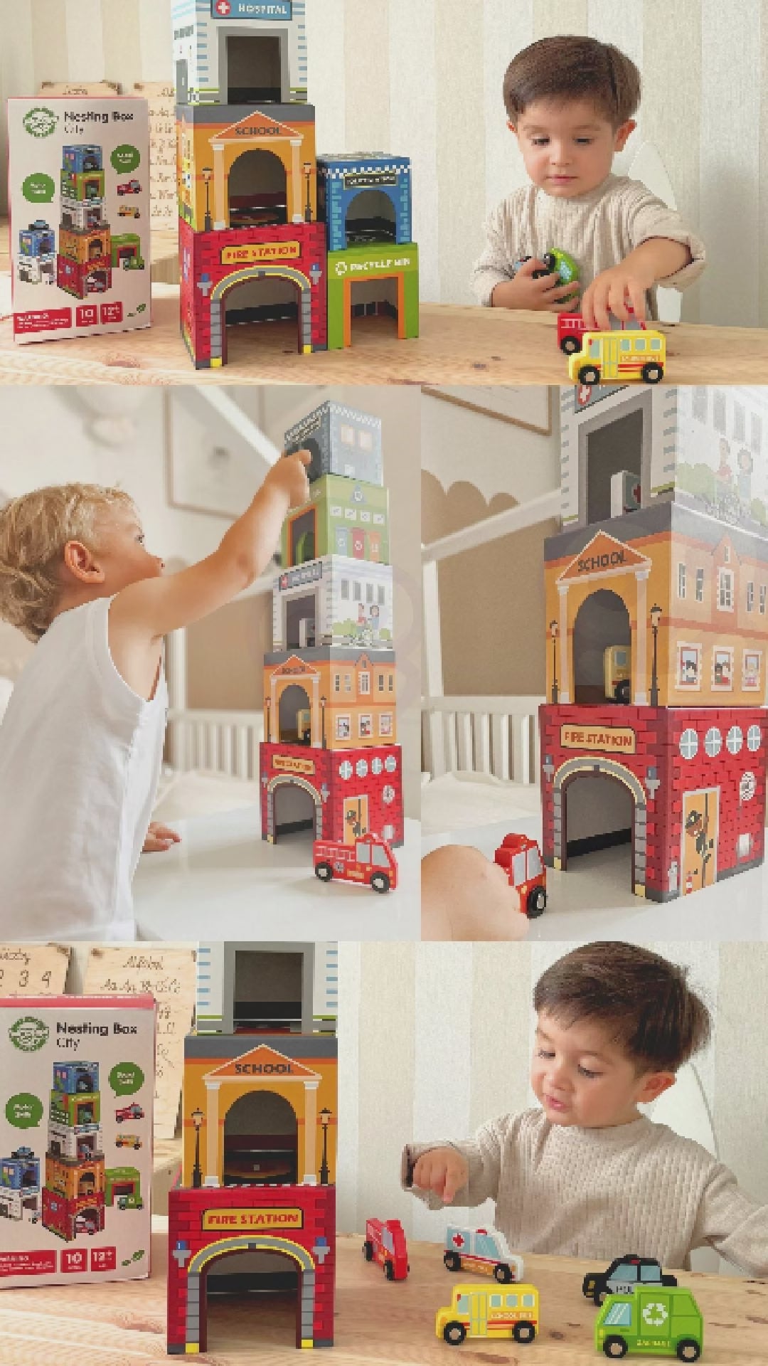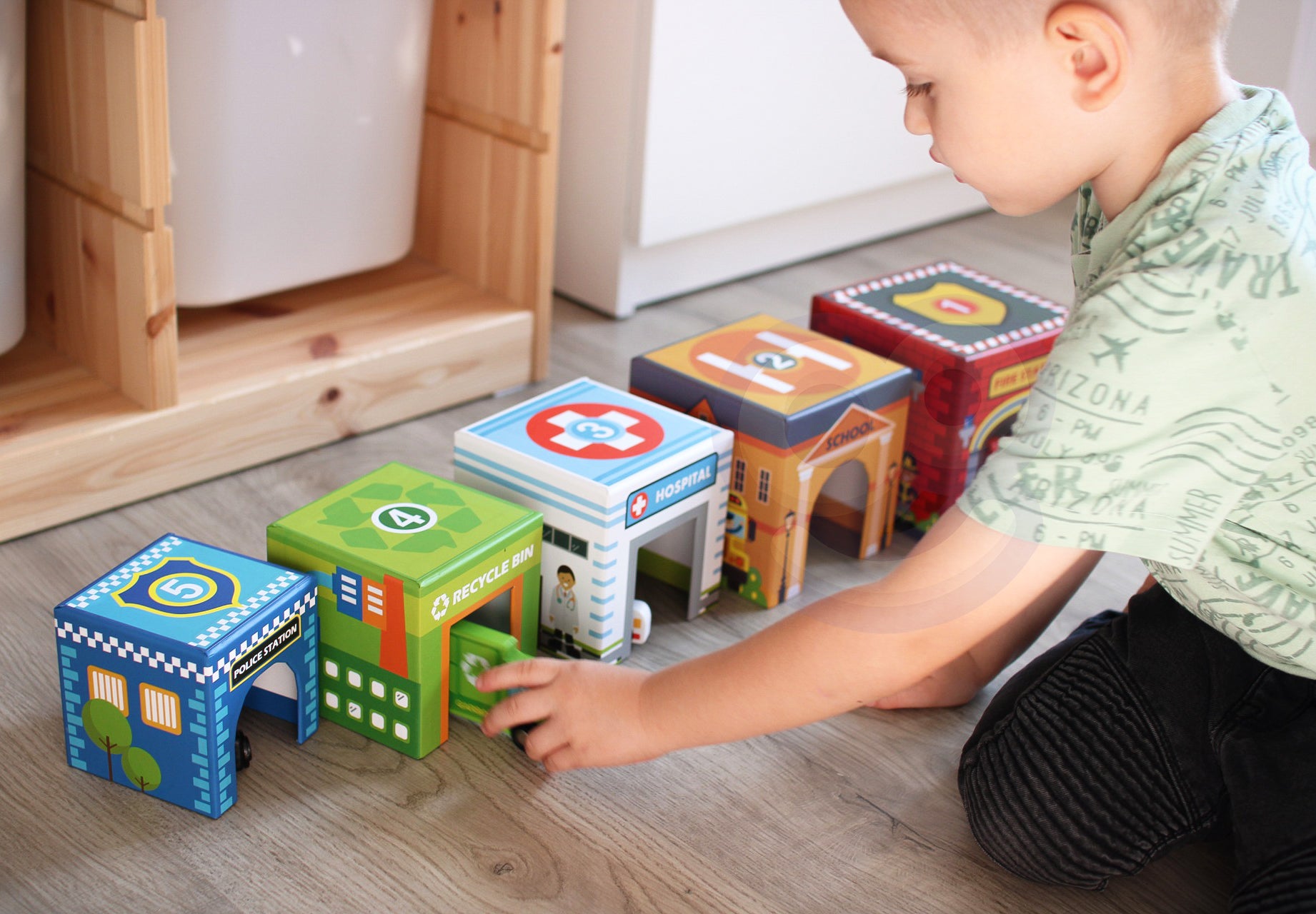 Otwory w kostkach umożliwiają dopasowywanie i przechowywanie pojazdów, a drewniane samochodziki dzieci mogą wpuszczać do wnętrza budynków, co jest idealną okazją do odgrywania codziennych scenek z życia miasta (straż, szkoła, szpital).