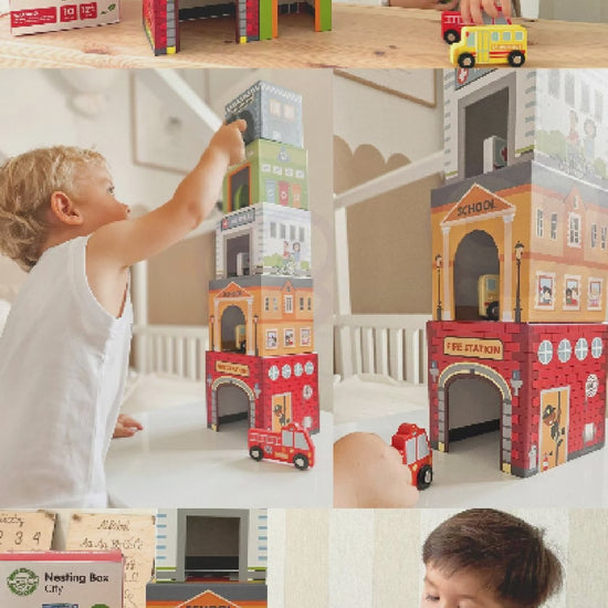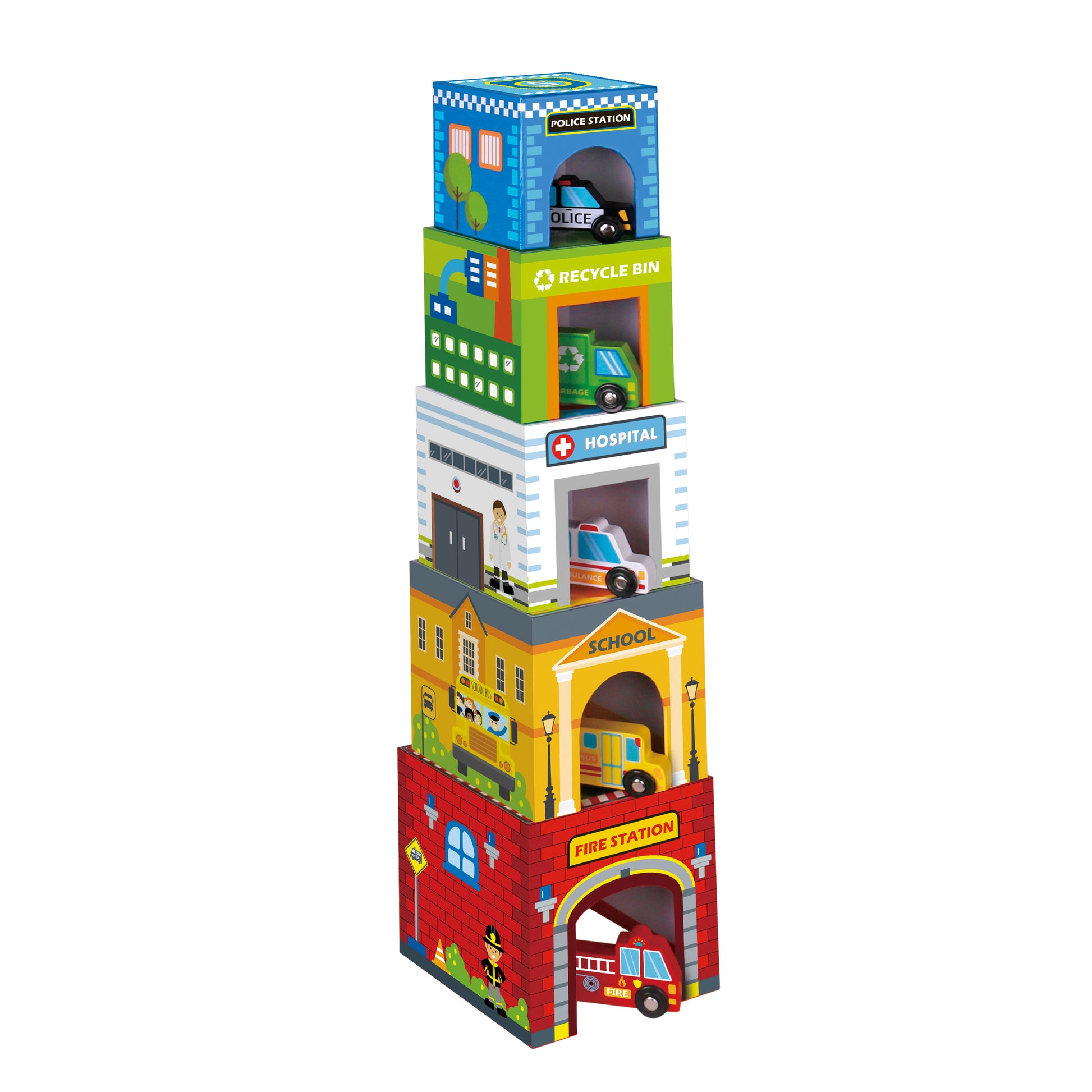 Zestaw zawiera 10 elementów: 5 ilustrowanych kostek o różnych rozmiarach oraz 5 uroczych, drewnianych pojazdów na gumowych kółkach. Każda kostka pasuje do pozostałych niczym element miejskiej układanki – można z nich budować wieże, dopasowywać pojazdy do odpowiednich budynków, a nawet wykorzystać je jako pojemniki na drobiazgi.