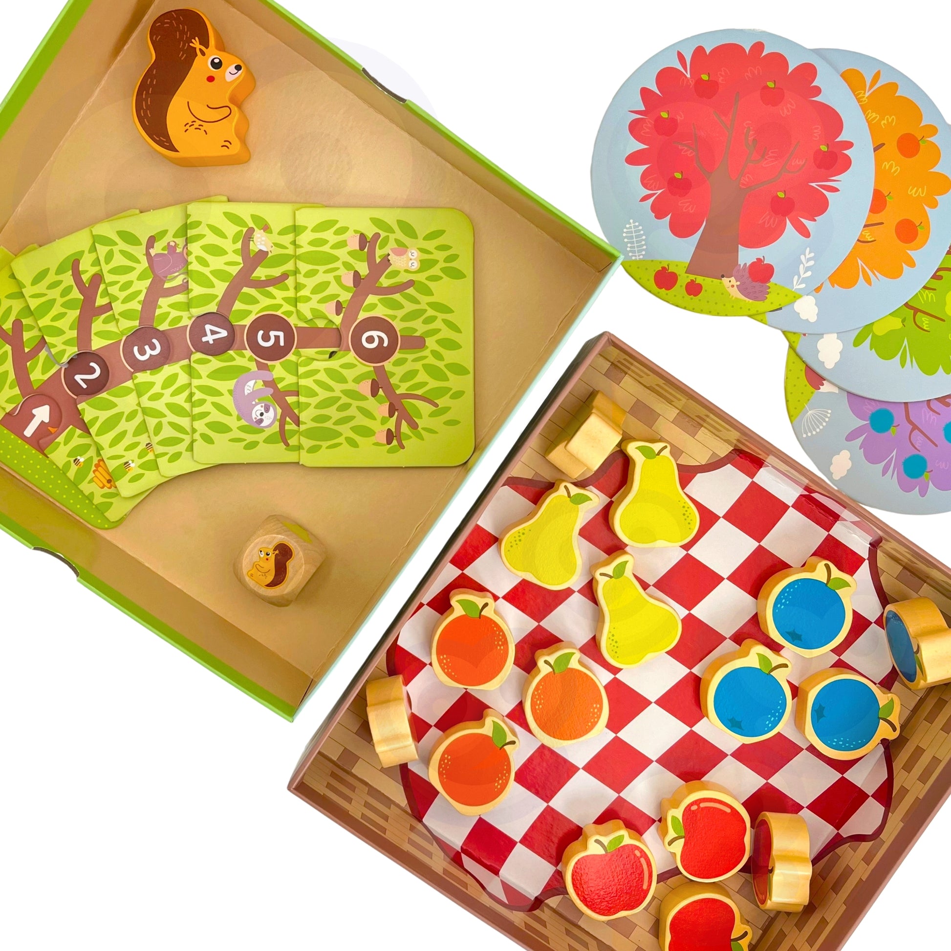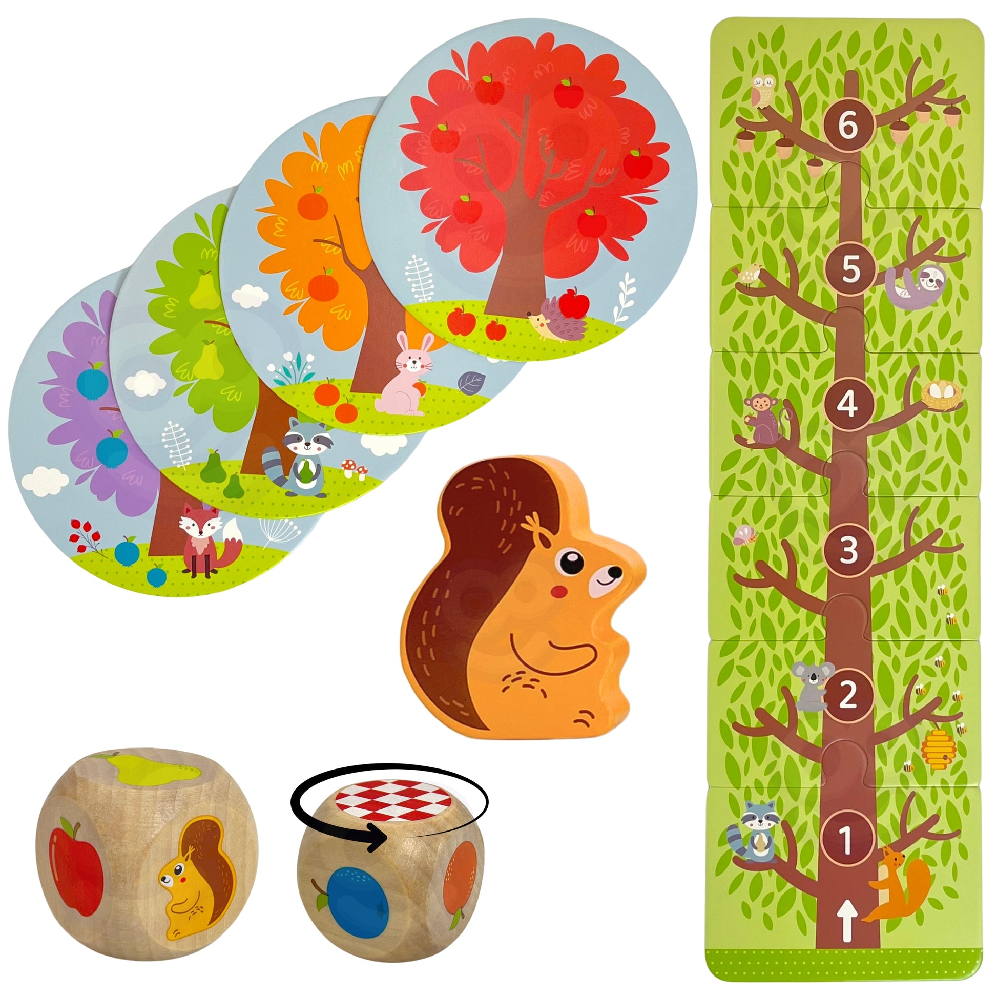 - Kostka do gry z obrazkami owoców i wiewiórki.