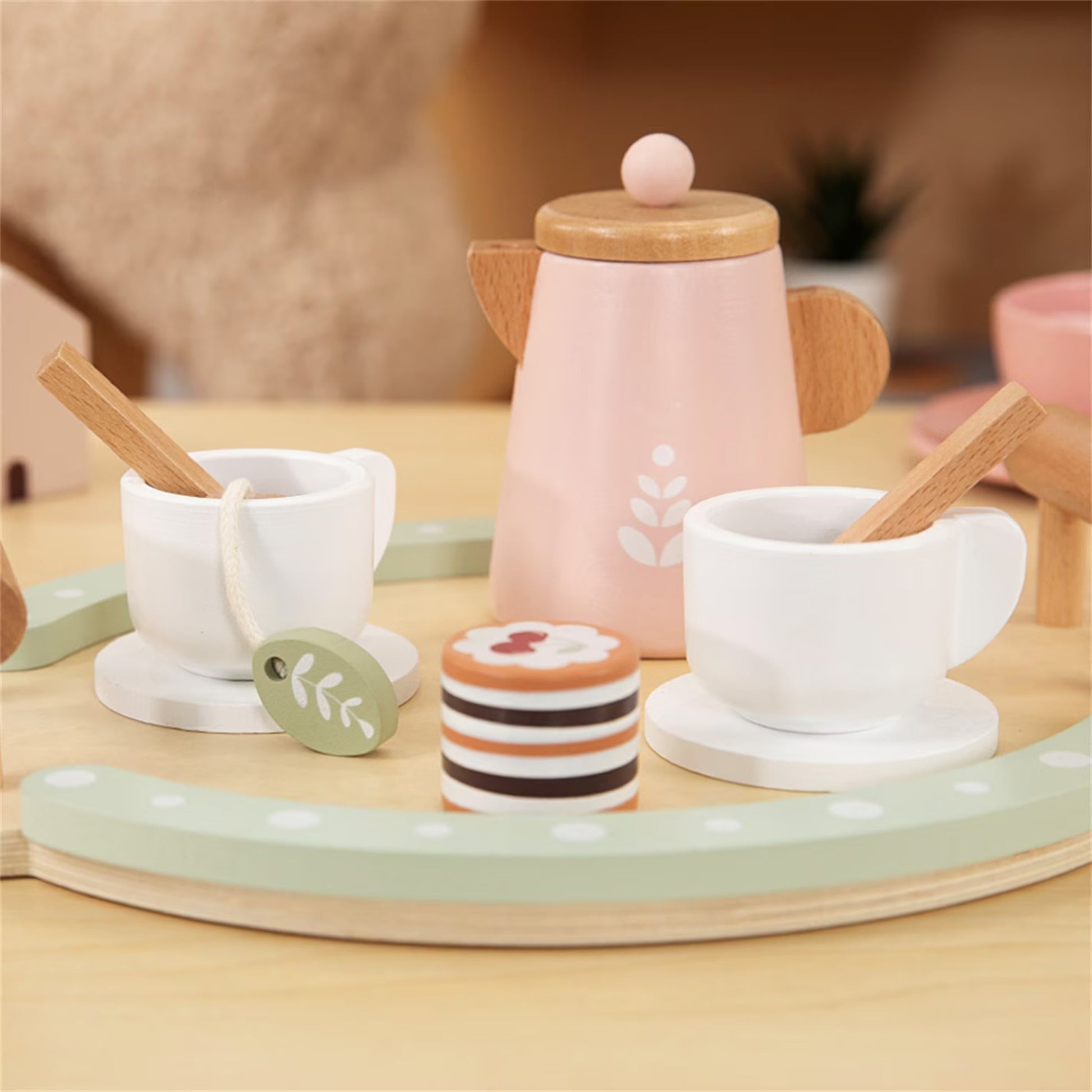Zestaw jest wykonany z wysokiej jakości, bezpiecznego drewna i zachwyca pastelową kolorystyką w odcieniach pudrowego różu i delikatnej zieleni. Dziecko może wcielić się w rolę gospodarza, serwując aromatyczną herbatę z dzbanka, pyszne babeczki i wykwintne ciasteczka. To idealny pretekst do wspólnej zabawy, która nigdy się nie nudzi.