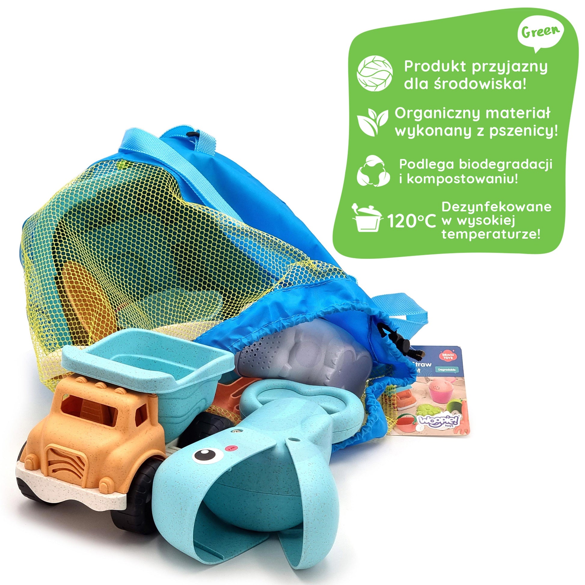 Wiaderko i konewka posiadają wygodne uchwyty. Zestaw zawiera specjalną łopatkę w kształcie ryby, tradycyjną łopatkę i grabki – idealne do kopania i tworzenia tekstur. Samochodzik (wywrotka) umożliwia transport piasku, a 3 foremki pozwalają na odlewanie kształtów. To doskonały sposób, by połączyć fantastyczną zabawę z nauką ekologicznej świadomości.